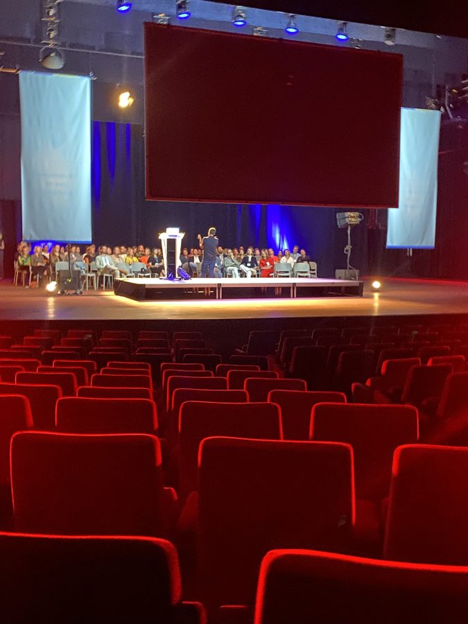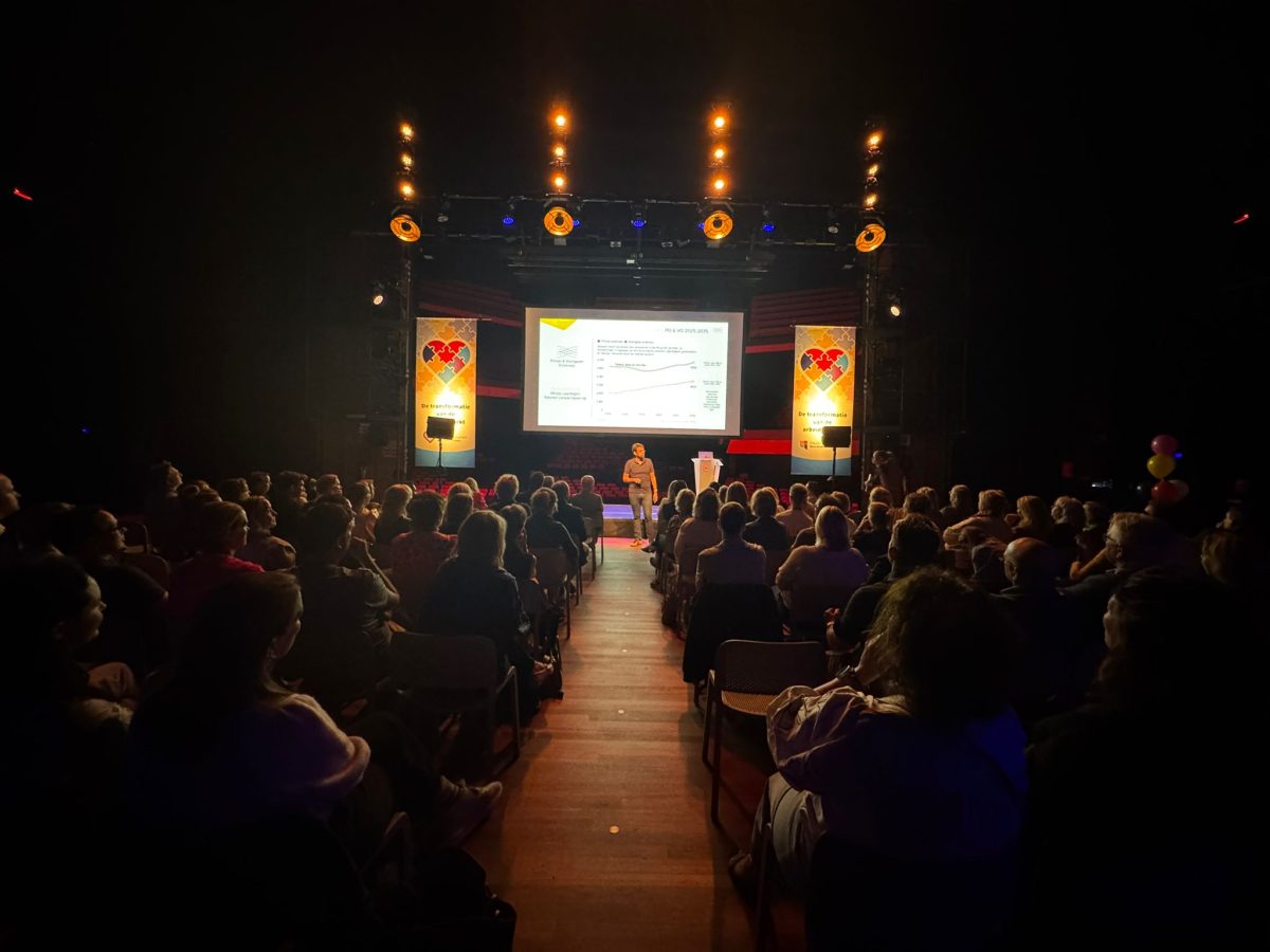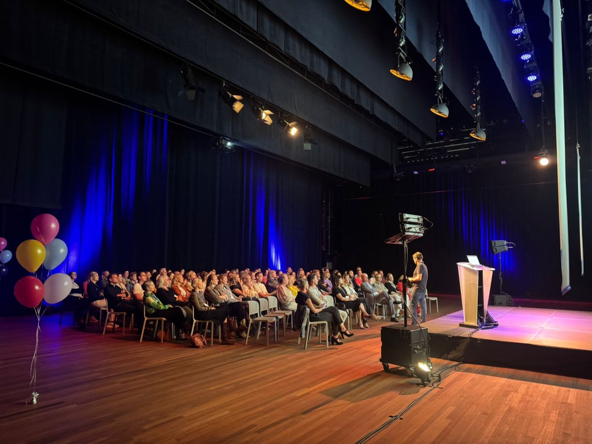 We kozen bewust voor een verrassende draai aan de gebruikelijke opstelling: dit keer namen de deelnemers niet plaats in de comfortabele pluche stoelen van de zaal, maar zaten zij zélf op het toneel. Precies daar waar normaal gesproken het verhaal verteld wordt. Daarmee kozen we niet alleen voor een unieke setting, maar gaven we ook direct invulling aan het centrale thema van de dag: anders denken, anders organiseren. Deelnemers waren letterlijk onderdeel van het podium én het gesprek.